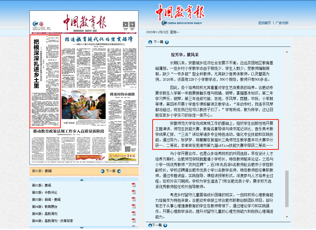 (二)小学教育专业。定向培养乡村教师项目近四届毕业生全部顺利在安徽省各地市公办中小学就业。近五年来,专业学生先后获得全国科学教育专业教学技能创新大赛、长三角师范生教学基本功大赛、安徽省高等学校师范生教学技能竞赛等省级以上竞赛一、二、三等奖70余项。2006届毕业生秦李,荣获全国劳动模范、全国优秀教师;2020届毕业生张梦梦在乡村学校服务仅一年,就获得宿州市优质课、教学竞赛一等奖和十佳青年教师。