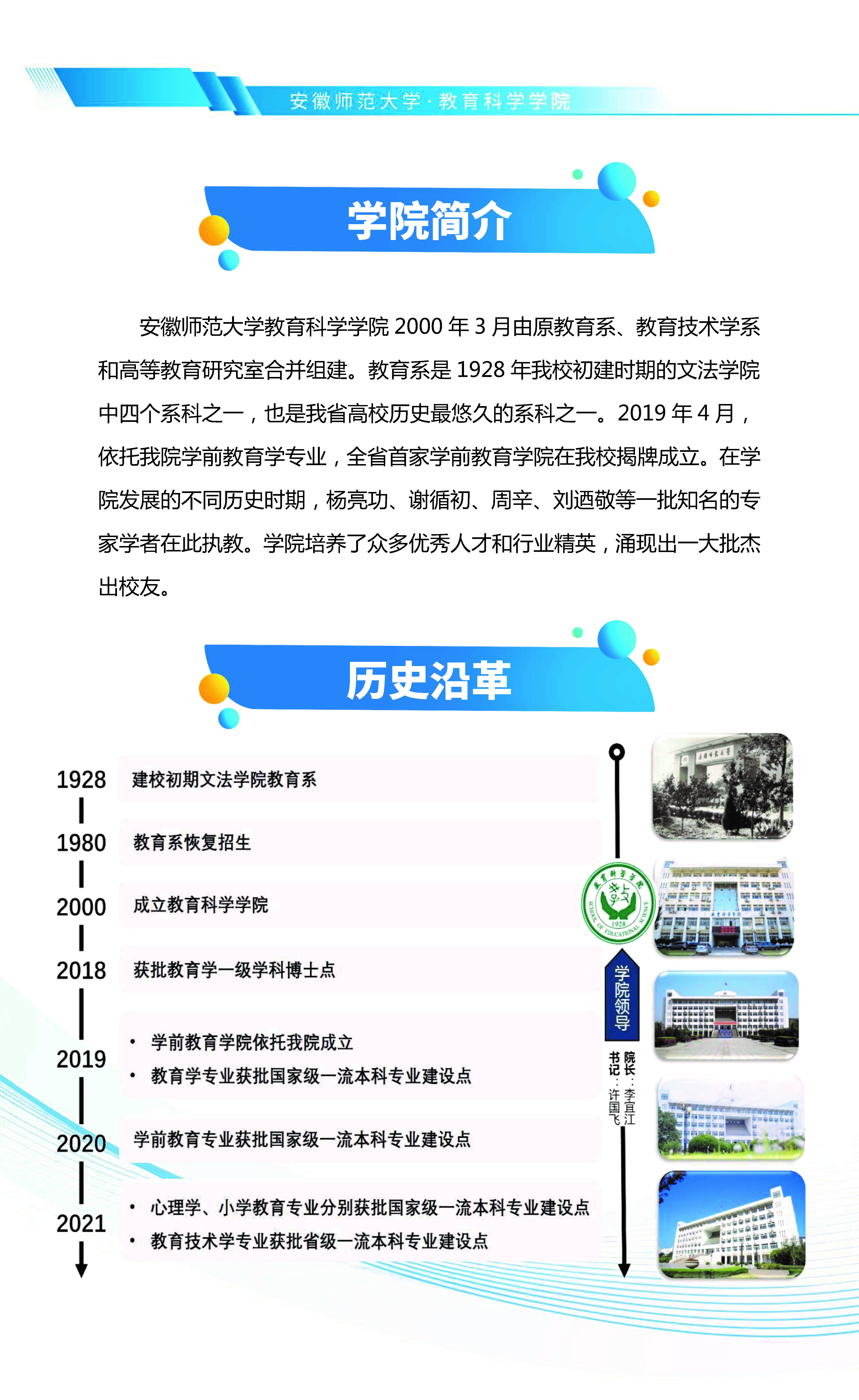 (五)教育技术学专业。近三年众多毕业生升学进入北京师范大学等知名高校深造,平均升学率为35%。毕业生进入合肥一中、安师大附中等知名中学、科大讯飞股份有限公司等著名教育信息化企业工作。培养的毕业生专业技能过硬,近三年学生在各类学课和技能竞赛中获省部级以上奖项100余项,涌现出全国劳动模范纪青滢、中科大教授高洪波、上海浦江学者徐四华、合肥市教科院副院长鲁先法、合肥一中高级教师汤磊、抖音系统架构师欧阳康等众多优秀毕业生代表。