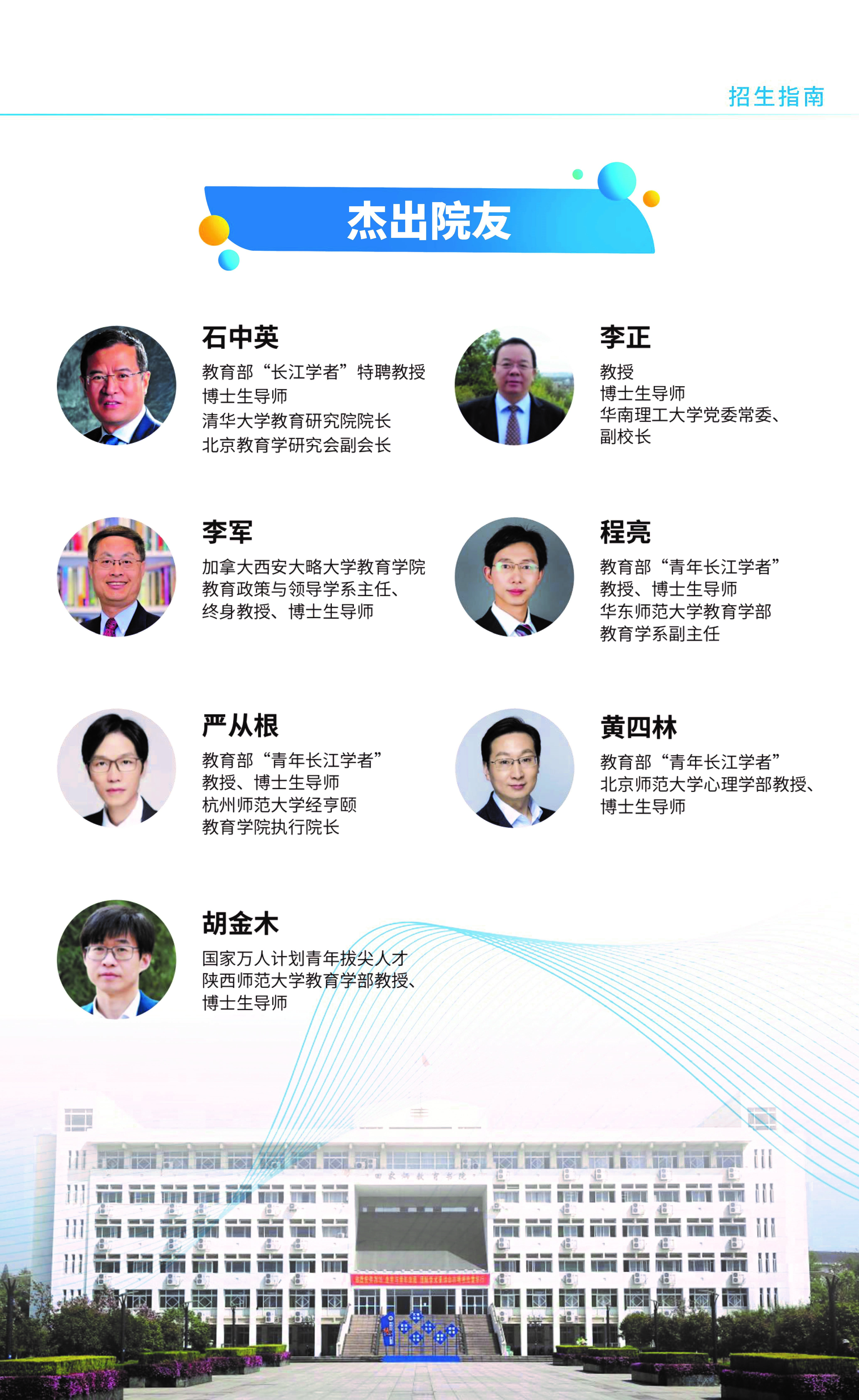 (一)教育学专业。本专业培养了一批又一批优秀毕业生,涌现出石中英、李正、李军、魏志春、孔燕、马健生、余秀兰、卜玉华、程亮、严从根、黄四林、胡金木等一批杰出校友。本专业学生发展渠道多元,就业形势良好,近五年,本专业初次就业率超97%,除了通过保研或考研进入北京师范大学、华东师范大学、浙江大学等名校继续深造,许多毕业生开始在教育行业崭露头角。