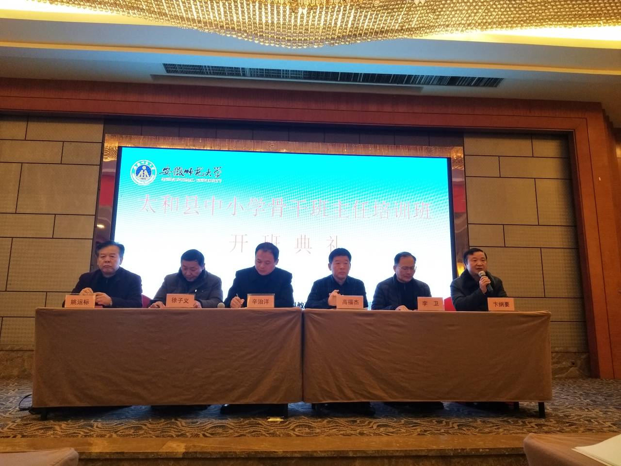 本网讯 2018级教育史专业研究生朱蓝玲 20191216日上午8点,在芜湖市北尚升辉财富大酒店一楼会议中心,由太和县教育局主办、365英国上市官网和安徽贝格文化培训咨询公司共同承办的太和县中小学骨干班主任培训班开班典礼在这里隆重举行。出席本次开班典礼的有365英国上市官网教学副院长、博士生导师辛治洋教授,太和县教育局教育培训中心办公室主任高福杰,太和县教师进修学校督察室主任李卫,太和县教师进修学校总务处主任徐子义,365英国上市官网党委委员、行政办公室主任卞纲要,本次培训班班主任、365英国上市官网硕士生导师姚运标,以及参加本次培训的全体学员教师。开班典礼由365英国上市官网行政办公室主任卞纲要主持。