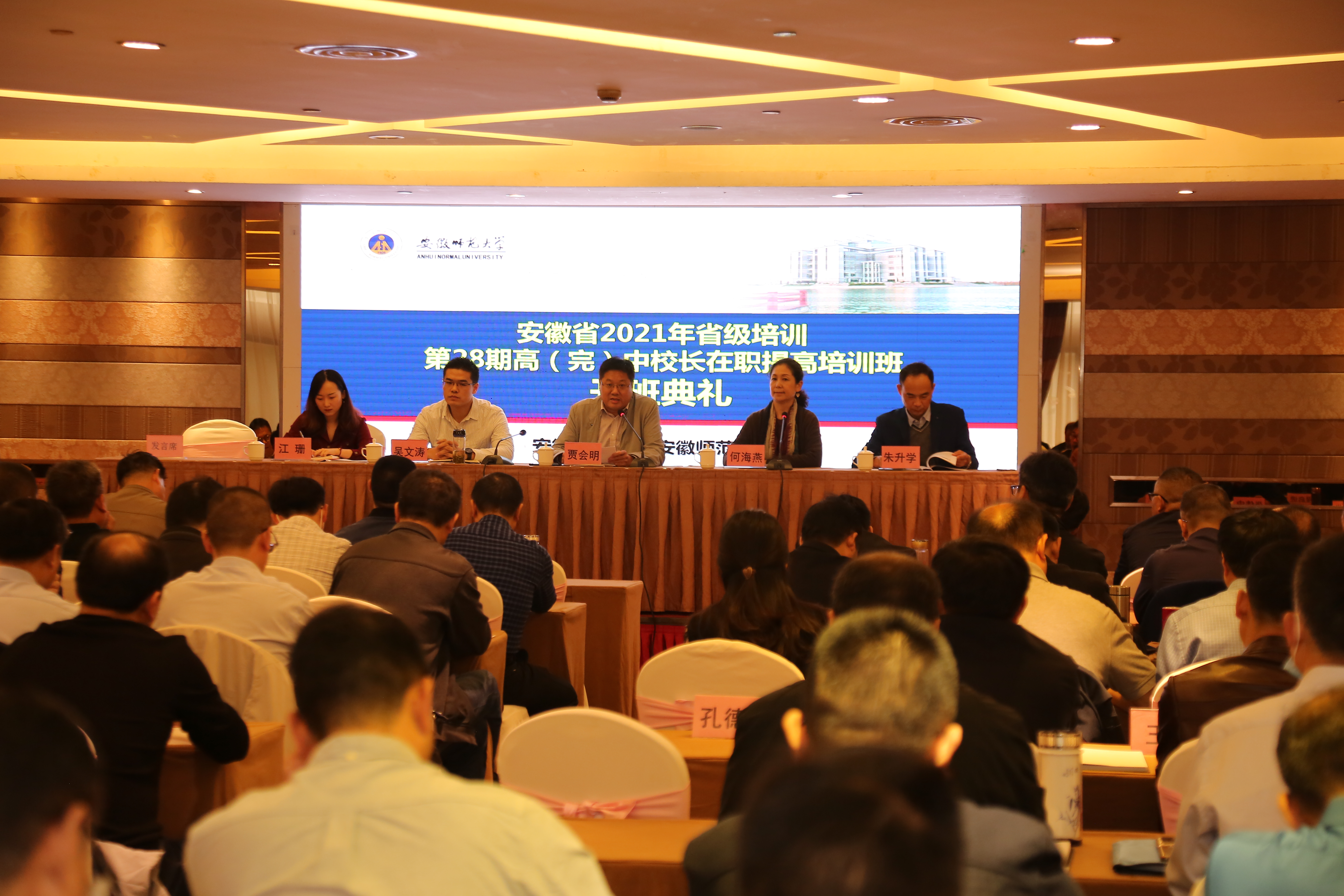 贾会明首先致开幕词。他代表安徽师范大学对本次培训班的举办表示祝贺,对前来参加培训的各位校长表示热烈欢迎。随后介绍了安徽师范大学的基本情况及办学特色,同时勉励大家要端正态度,安心学习;联系实际,善于学习;遵守纪律,安全学习。希望每位学员尽快转变角色,注重点滴积累,积极参与交流研讨,确保学有所获。
