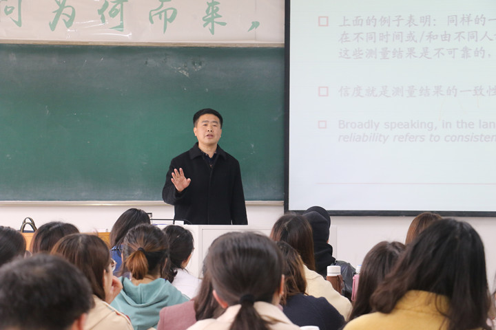 本网讯(教科院 王道阳)2019年3月28日下午,心理学专业的校级教学名师、博士生导师赵必华教授在赭山校区田楼8409教室举行了《测量心理学》中“测量的信度”的本科教学示范课,授课对象为2016级心理学专业学生。学校及学院教学督导组专家、学院领导、部分中青年教师及心理学专业全体教师共同观摩了此次示范课。
