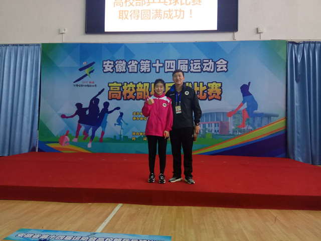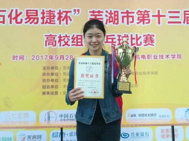台上三分钟,台下十年功。比赛前的她不忘认真准备,每周五次的训练,两个校区来回奔波的辛劳不足以成为她前进的阻碍。教练为了磨练她们的意志力,让她们在三月的操场上跑步十圈,虽然每个人都气喘吁吁,但一次次的“魔鬼”训练为她们在后来的比赛的成功打下了坚实的基础。功夫不负有心人,从2017年校乒乓球比赛赭山校区女子单打第一到2018年安徽省省运动会高校组公体组女子单打三等奖是她努力的回报。