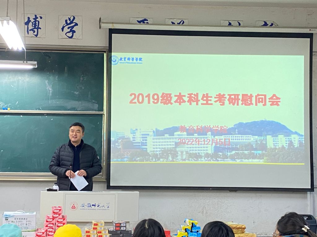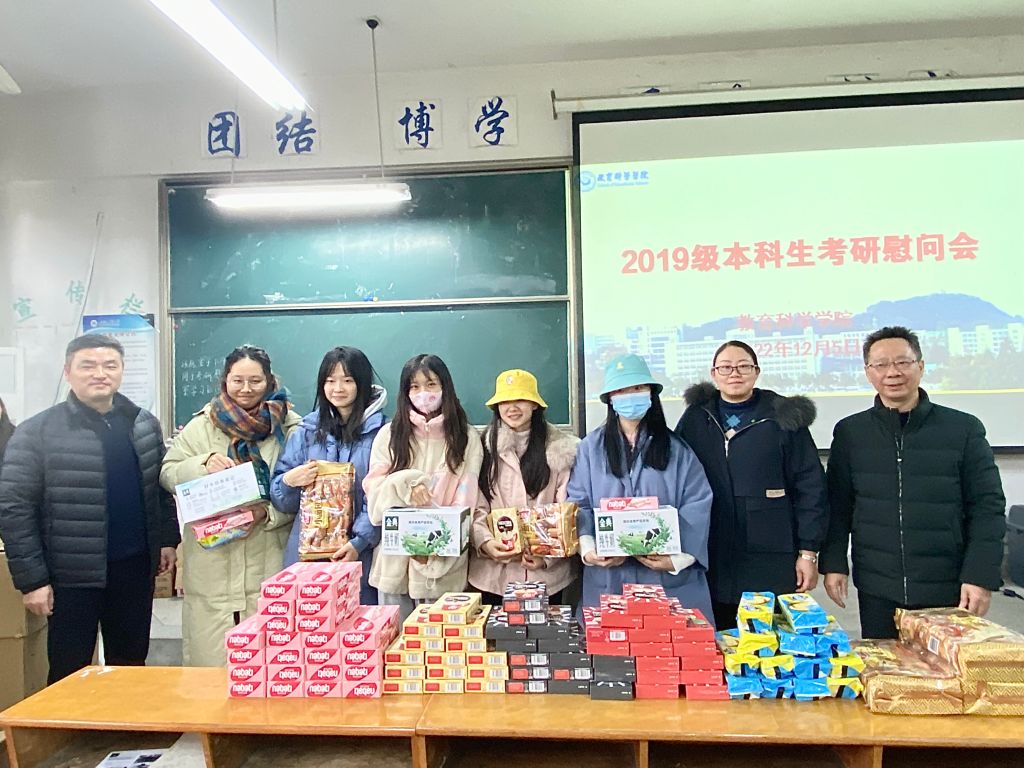 (教科院 邓心宇)情系考研生,温暖考研路。为鼓舞考研士气,帮助考研学子缓解备考压力,教科院于2022年12月5日下午在田楼8101教室慰问考研学子,为冲刺阶段的考研学生送去暖心礼包。院党委书记方泓,院长李宜江,院党委副书记杜凤,副院长何海燕、张更立、吴文涛,2019级本科生辅导员濮楠楠以及2019级全体考研学子参加了本次活动。