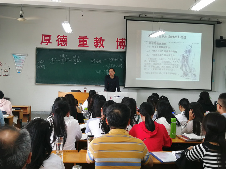 本次公开课的教学内容为《中国教育史》课程中“春秋时期的教育思想”部分的内容,重点是孔子的教育思想。孙老师首先介绍了孔子的生平和教育活动,让学生对孔子有了基本的了解。而后重点讲述了孔子的教育作用论,分别从教育的社会作用和对人的发展两方面来讲述。在讲述教育的社会作用时,孙老师介绍了孔子“以德治民”的思想,引导学生一同品味“道之以政,齐之以刑,民免而无耻;道之以德,齐之以礼,有耻且格。”通过与学生的共同探讨,让学生深刻地理解教育对社会政治、经济的重要作用。在讲述教育对人的发展时,孙老师先启发、鼓励学生表达对“性相近,习相远”这句话的看法,之后结合诸多现实案例对这句话进行更深层次的剖析,条理清晰,严谨规范,加深了学生对相关知识内容的理解,起到了良好的引领示范作用。