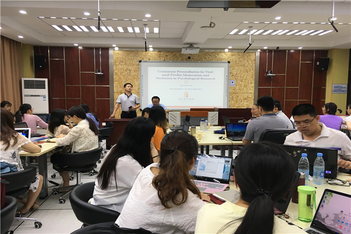 本网讯(文/吕碧君 图/叶舒婷)6月8日-9日,我院心理学“检验中介/调节模型”工作坊第一期在田家炳教育书院502智慧教室正式启动。美国工业与组织心理学会、美国管理学会会员、奥本大学心理系范津砚博士应邀担任本期工作坊的主讲人。应用心理学硕士点负责人、博士生导师赵必华教授主持工作坊活动。心理学、应用心理学专业宣宾教授、李小平副教授、何元庆副教授等老师出席,心理学方向研究生到场聆听学习。