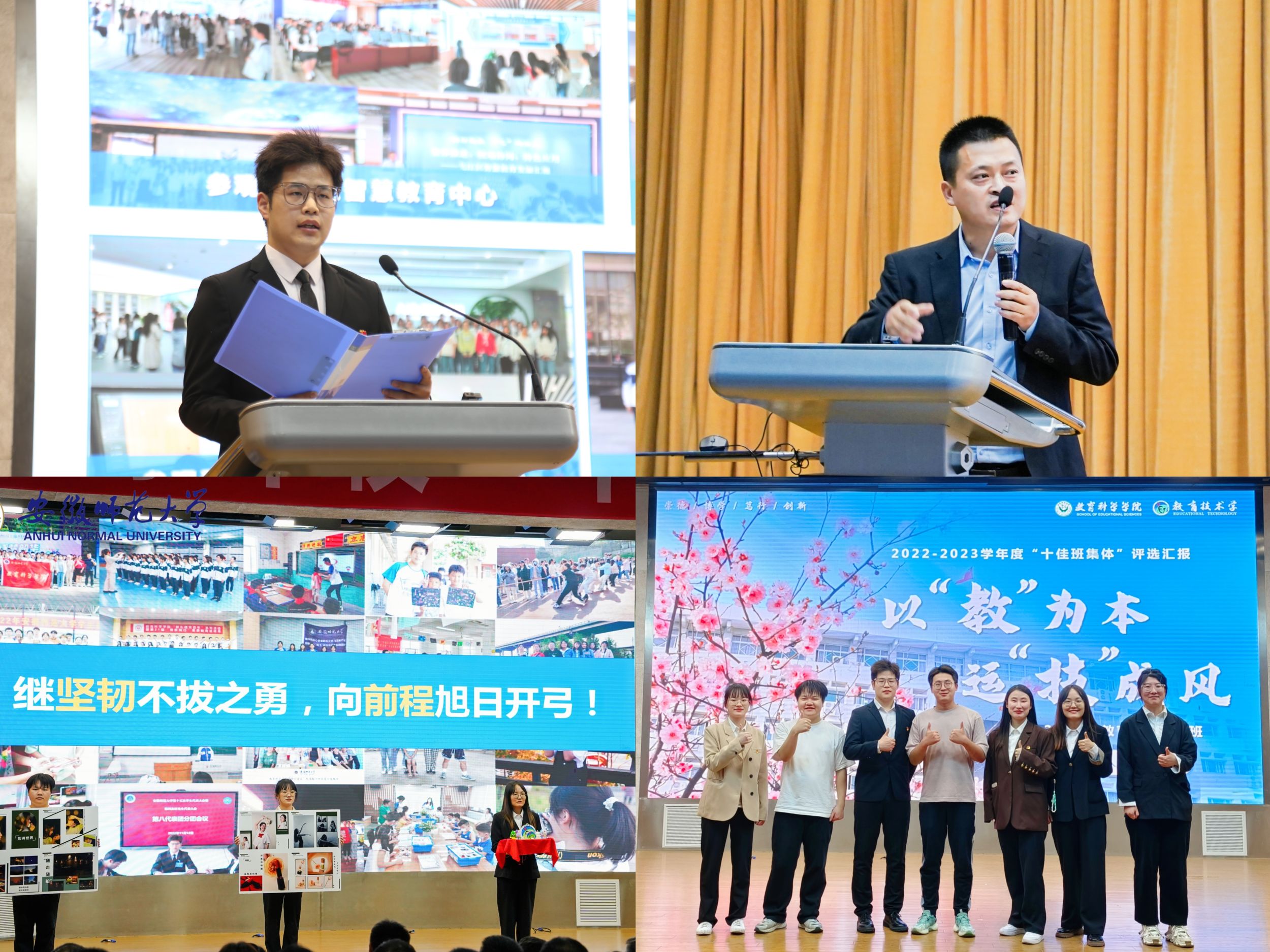 11月8日下午,安徽师范大学2022-2023学年“十佳班集体”风采展评会在花津校区举行。教育科学学院2020级教育技术学1班在本次“十佳班集体”评选中以精彩的表现脱颖而出,荣获“十佳班集体”荣誉称号,充分彰显了教科学子奋发有为、勇于突破的精神风貌。该班也是继2019年2017级教育技术学1班之后,学院再次获评校“十佳班集体”的班级。