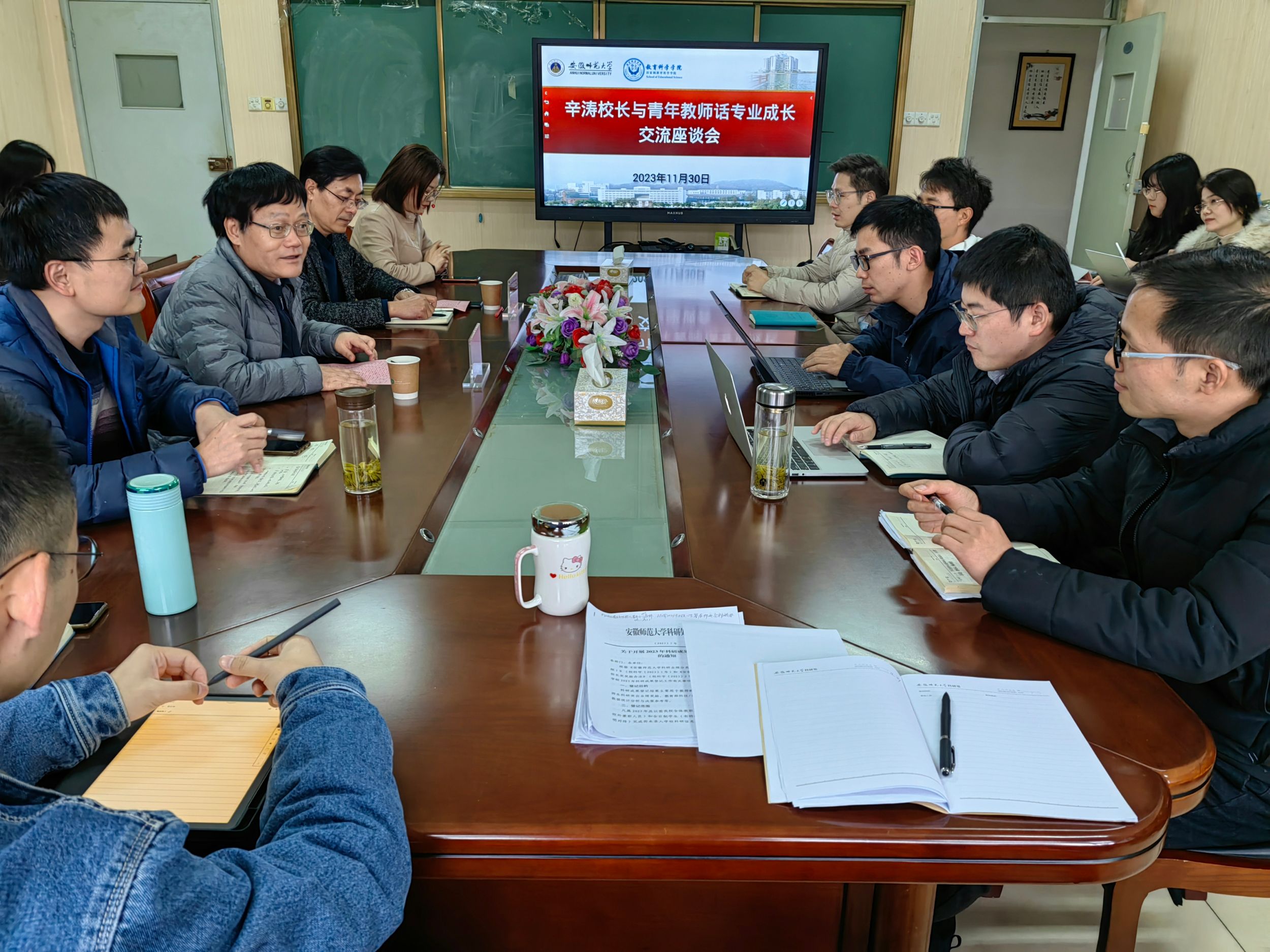 辛涛在认真听取与会人员发言的过程中,不时地与各位老师交流、研讨,并就大家关心关注的问题分别给予了解答与回应。他指出,当前学校大力推进“基础教育振兴”“学科振兴”“大学生护航”三大行动计划,青年教师要保有锐气,快速发展,在行为上求中庸,在目标上求卓越。2023年即将进入尾声,他对青年教师提出三点建议:第一,在做好个人年终收尾各项工作的同时,也要多关注学生成长的动态,做到科学研究与人才培养并行不悖。第二,在科研产出上,鼓励大家追求有质量的数量,多关注现实问题与政策导向,注重学术积累,在高级别课题申请上尽早突破。第三,团队建设上,勉励青年教师多与老教师开展学术联结,加强优势学科与特色团队建设,强化学术共同体引领,大力服务安徽基础教育大发展。