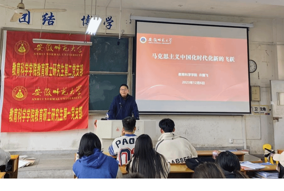 为深入学习贯彻习近平新时代中国特色社会主义思想,进一步激励广大研究生党员加强学习、实干担当;2023年12月6日下午,教育硕士研究生第一党支部和教育硕士研究生第二党支部共同邀请365英国上市官网党委书记许国飞在田家炳楼8101教室以“马克思主义中国化时代化新的飞跃”为题讲授党课。活动由教育硕士研究生第一党支部书记徐贝贝主持,两个支部全体党员及入党积极分子参会学习。