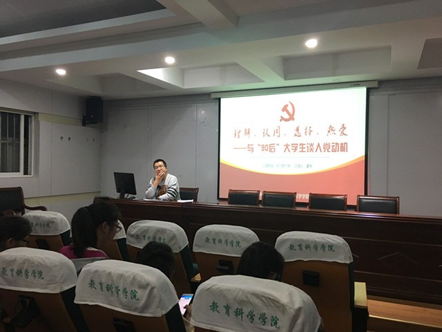 随后,龚伟老师结合自身的入党经历和切身体会,以幽默风趣的话语,从理解和认同两个方面与同学们交谈了入党动机的问题。龚伟老师不断举例,抛出问题,启发同学们深入思考。他希望同学们“吃苦尝乐——吃思想之苦,尝思享之乐”,对大学之人、社会之事、身边之物要有自己的领悟,这样才能真正感受成长的快乐。