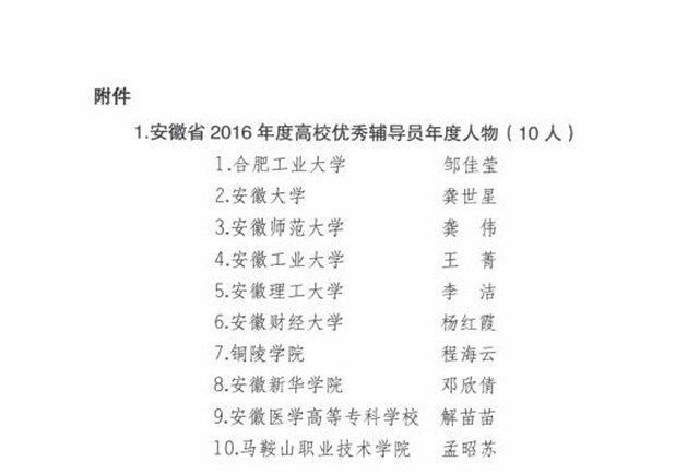 本网讯(教科院 张启山)日前,省委教育工委下发了《中共安徽省委教育工委关于公布2016年度全省高校辅导员年度人物和优秀辅导员的通知》,我院2014级专职辅导员龚伟老师被授予“2016年全省高校优秀辅导员”荣誉称号。