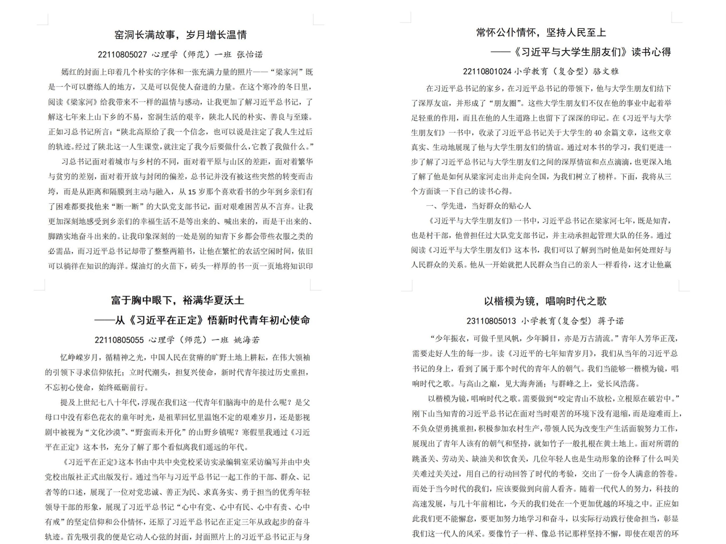 青春共读,坚定理想信念。水激石则鸣,人激志则宏。为激发同学们爱国主义精神,培养新时代好青年,学院积极引导学生认真阅读《习近平的七年知青岁月》《梁家河》《苦难辉煌》《习近平用典》等相关书籍,并撰写读书笔记和学习心得。同学们在阅读过程中感悟前辈们敢于吃苦、甘于奉献的奋斗岁月,明确自己的担当与使命,强化自身的知识储备和道德修养。