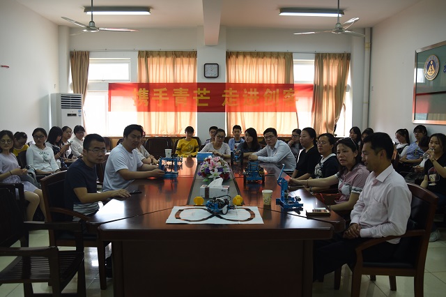 随后,张如华向青芒创客协会进行授旗。青芒创客协会的会旗由两个“C”组成芒果的形状,以青绿色为底色。寓意为“青年创客,展现锋芒”。社团代表对创客课程、科技产品进行了详细的介绍,来参加此次会议的学生进行了小车组装、操作体验,现场感受创客的乐趣。