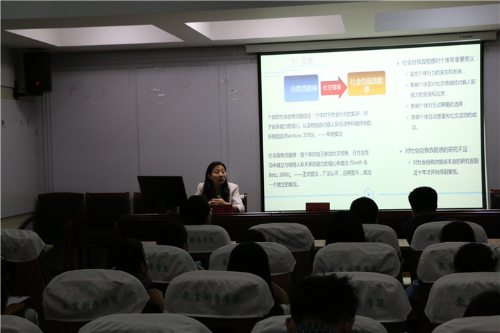 讲座伊始,赵必华教授简要介绍了孟慧老师所涉及的心理学研究领域以及专长,代表我院热烈欢迎孟慧教授指导工作并做学术报告。孟慧教授表示非常高兴能够来到安徽师范大学交流与分享,并就自己目前所专注的研究领域自我效能感,分别从六大方面介绍其相关研究。孟教授以“自我效能感对中国大学新生适应情况:一项纵向研究”为例,系统阐述了自我效能感研究的内涵与外延,并提出未来研究的展望。学术报告为2015级、2016级研究生提供了新的研究方向与方法,学术讲座让学院师生感受到孟教授科学研究的专注和严谨态度。部分教师及研究生就报告相关内容进行了提问,孟慧教授就相关问题一一进行了解答,得到了现场师生的一片喝彩。