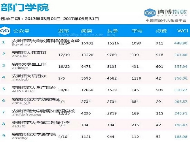 本网讯(教科院 陈娜娜 马舒婷)在刚刚结束的安徽师范大学校园新媒体影响力排名的评比中,教科院官方微信凭借三月份15302/篇的浏览量和WCI突破420+拔得头筹,位居校园新媒体排行榜首,首创历史新高。