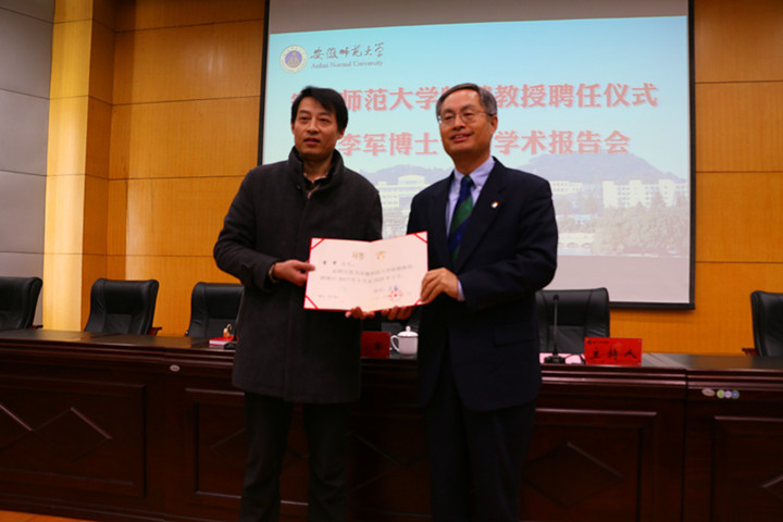 讲座伊始,桑青松代表学院对优秀院友李军的到来表示热烈欢迎,校人事处处长朱为民亲临现场为李军颁发安徽师范大学特聘教授证书。李军博士对此表示感谢,同时对母校安徽师范大学也表示了崇高的敬意,他在深情回忆起母校求学的经历时,反复感叹“回家真好”,情到深处不禁落泪,感人至深。