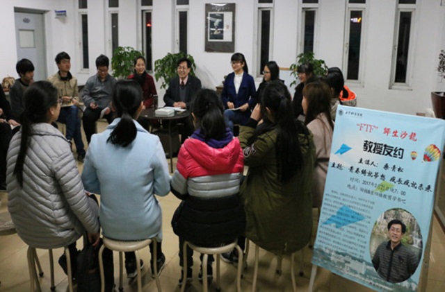 本网讯(教科院 张启山)解疑答惑,师生同乐。为了加强师生之间的交流,使教师既是知识的传播者,更是学生成长路上的指引者,学院团委学生会于3月21日,在学院教育学书吧举办了首期“教授友约”师生沙龙活动,本期邀请的嘉宾为院长桑青松教授。