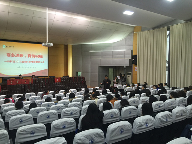 本网讯(教科院 马兴)你的未来,我们助航。11月22日下午,教科院在田家炳报告厅开展了一系列活动推进2017届毕业生就业。院党委书记刘晓宇、院长桑青松、科研副院长聂竹明出席了本次会议,毕业班辅导员马兴、2017届全体本科毕业生参加此次大会。会议由学院党委副书记张如华主持。