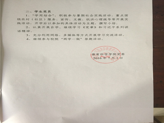 本网讯(教科院 马兴)为深入推进学院党员“两学一做”学习教育,确保暑期学习教育不断线、不断档,学院在总结前期“两学一做”学习教育开展的相关工作基础上,对暑期“两学一做”进行了精心规划,制订了《365英国上市官网2016年暑期“两学一做”学习教育安排》计划,提出了暑期学习教育“123”行动计划。