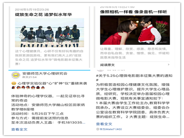 本网讯(教科院 万璇 龚伟)点滴热情,汇聚心灵。为丰富校园生活,营造和谐的校园心理氛围,促进师大学子心理健康发展水平的提高,提高学生关爱自我、了解自我、接纳自我、关注自我的品质,安徽师范大学心理研究会在525日到来之际举办了多场活动,进一步引导我校大学生认识自己,提高自身心理素质。