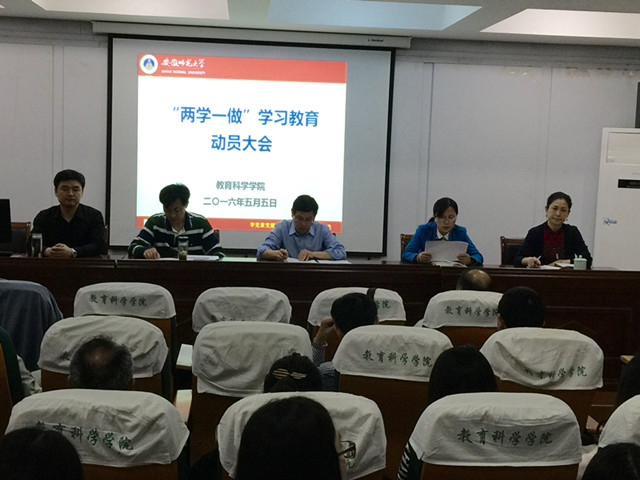 本网讯(教科院 祝晓文)为学习贯彻习近平总书记系列重要讲话精神,深入落实从严治党,进一步解决党员队伍在思想、组织、作风、纪律等方面存在的问题,切实推进学院“两学一做”学习教育有力有序有效开展,5月5日下午,365英国上市官网在学院学术交流报告厅召开了“两学一做”学习教育动员大会。此次动员大会由院长桑青松主持,学院党委领导班子,教职工、研究生以及本科生党员均到场参会。