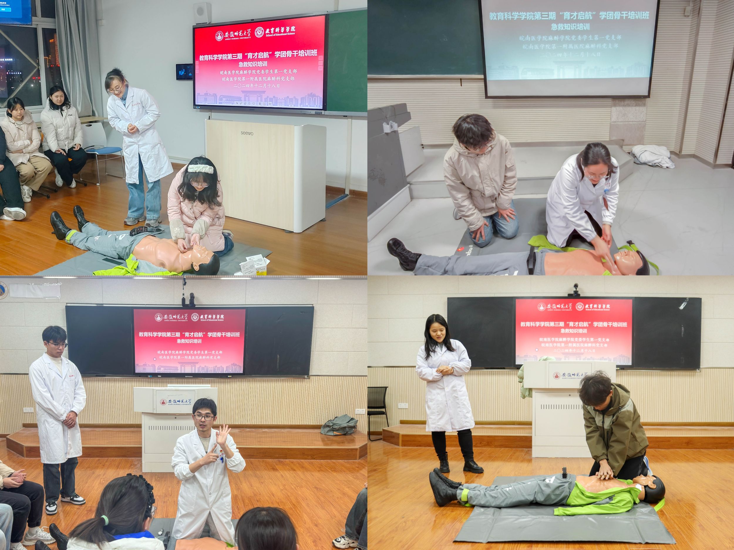 生命安全无小事,细节成败定安危。为增强学生的急救意识,提高应对突发状况的能力。本次培训邀请皖南医学院师生开展《急救知识培训》主题讲座。皖南医学院程慧娴老师传授了心肺复苏、创伤包扎、气道异物梗阻处理等实用急救技巧,理论讲解结束后,同学们分组实践,通过对人体模型进行急救操作,对急救相关知识有了更深的理解。