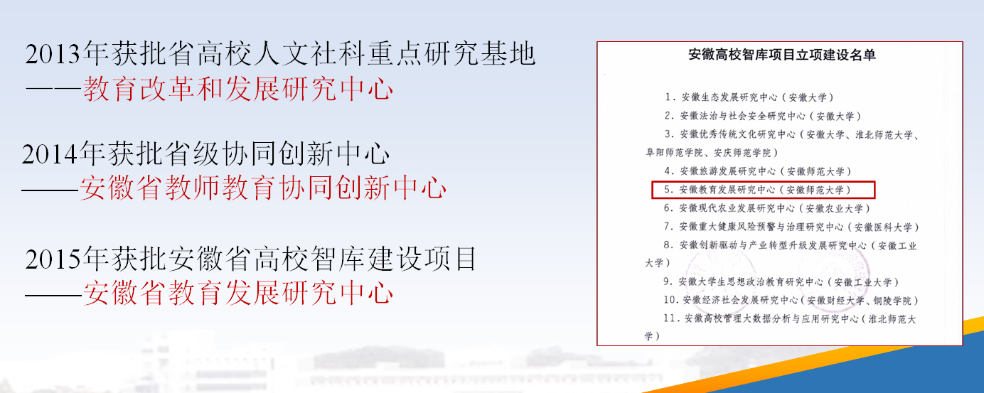 我院李宜江教授主持申报的安徽省高校智库计划“安徽教育发展研究中心”获得立项,阮成武教授领衔获批“安徽省教育硕士专业学位案例教学推广中心”。