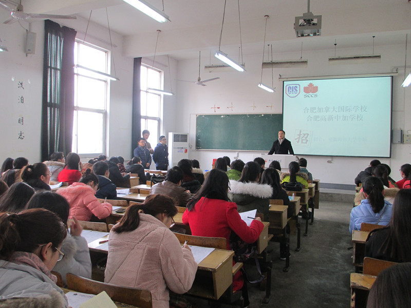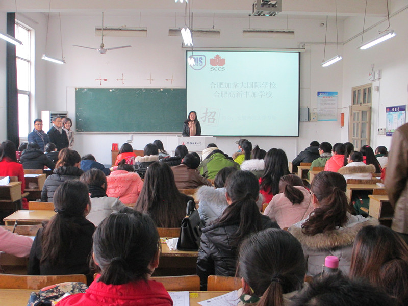 招聘会初始,合肥高新中加学校的吴校长针对本学校的办校理念、发展规模、未来展望等多个方面作了详细介绍。吴校长说道:“合肥高新中加学校在全国共有11所分校,基础设施一流,此次招聘的目的在于为学校的快速发展注入新活力。一流的学校加上一流大学输入的一流学生,我们相信学校的未来会更美好!”随后,该学校的陈主任通过播放精彩的宣传片,向广大同学介绍了学校的具体情况,特别强调了该校实行的是素质教育,无应试压力,使同学们对合肥高新中加学校有了一个更深的了解。招聘会接近尾声,该校的领导老师针对在场同学求职关注的问题进行了一一解答,同学们也表示极大的热情,对自己心仪的岗位投上了简历。