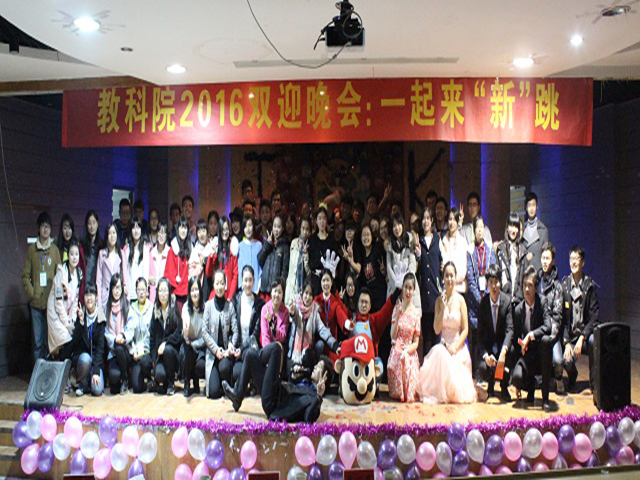 本网讯(教科院 代青清)新年新气象,欢乐迎新生。12月12日晚上7点,教科院2016年“双迎晚会”在赭山校区团委多功能厅隆重举行。院党委副书记张如华老师,团委书记龚伟老师,15级辅导员莫大贡老师,兄弟学院学生会干部、学院协会骨干以及院全体大一新生和部分13、14级老生到场观看晚会。