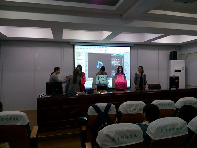 讲座开始,汪红诚老师先是从一般音乐教育与幼儿音乐教育的对此入手,讲述了幼儿园音乐教学的基本内容与教学特点,指出让幼儿展现能力比表现技巧更重要的课程目标。随后汪老师分别从音乐教学的"四大领域"——欣赏活动、歌唱活动、打击乐和集体舞,结合教学案例,为同学们生动地展示了一堂轻松的音乐课是如何'炼'成的。一首《音乐之声》的主题曲在汪老师的经验智慧下被改造成了《做饼干》——每一节音符的跳动都成了做饼干的若干步骤,随着"饼干"的出炉,音乐节奏也深深印在了幼儿的心里;在歌唱部分,汪老师强调了教师在范唱时,必须遵循"先清唱再伴奏"的轻唱原则,这样才能让幼儿耐心、富有兴趣地进行下去,养成一双善于倾听的耳朵;对于音乐教学中公认的重难点——打击乐,汪老师表示,掌握好课堂节奏,把握住孩子的兴趣,打击乐教学依然可以轻松进行!她从音乐的选择到总谱的设计,再从总谱的变通到乐器的加入,均以实际的案例和有趣的示范引得同学们连连赞叹和深深折服,现场掌声不断。此外,汪老师还和学前学子们慷慨分享了自己多年教学的窍门心得,让大家获益匪浅。而每一次的游戏互动,不仅让同学们重温了童年音乐之乐,更让大家亲身感受到简单的教学法带给音乐课堂的轻松活泼,而这一切都离不开执教人细腻的智慧。
