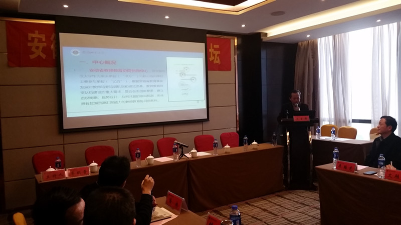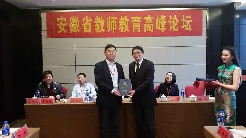 论坛开幕式由我院院长葛明贵教授主持,安徽师范大学校长、安徽省教师教育协同创新中心主任王伦教授致欢迎辞。王伦校长对各位特邀专家及来自全省各高校的教育学院(系)院长(主任)表示热烈地欢迎,对论坛成功举办表示热烈地祝贺,并向协同创新中心聘请的学术委员会成员颁发了聘书,聘请北京师范大学朱旭东教授担任该中心学术委员会主任,华东师范大学胡惠闵教授、东北师范大学饶从满教授、《教育发展研究》编辑部林岚主任为学术委员会副主任,全省13所高校教育学院(系)院长(主任)任学术委员会委员。开幕式上,安徽省教师教育协同创新中心执行主任、副院长阮成武教授作了协同创新中心的工作报告。报告从中心概况、目标任务、主要工作、校际协同计划等四个方面,阐述了协同创新中心工作开展情况、阶段性成果和未来的工作设想。