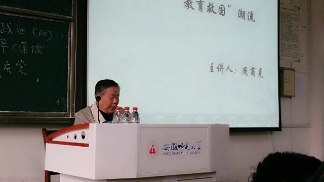 八十多岁的周商克先生精神矍铄,以在黑板上题写为“教育救国”事业作出重大贡献的部分学者的名字为开场,接着向同学们详细介绍了各位先辈的事迹。比如,“不做官、不发财,终身献给劳苦大众”的晏阳初先生;主张“生活即教育、社会即学校、教学做合一”的陶行知先生;在山东邹平进行乡村建设实验的国学大师梁漱溟先生;一生致力于职业教育的黄炎培先生;毁家办学的高践四先生;师大教育系第一任系主任周辛先生;主张民众教育的俞庆棠先生。