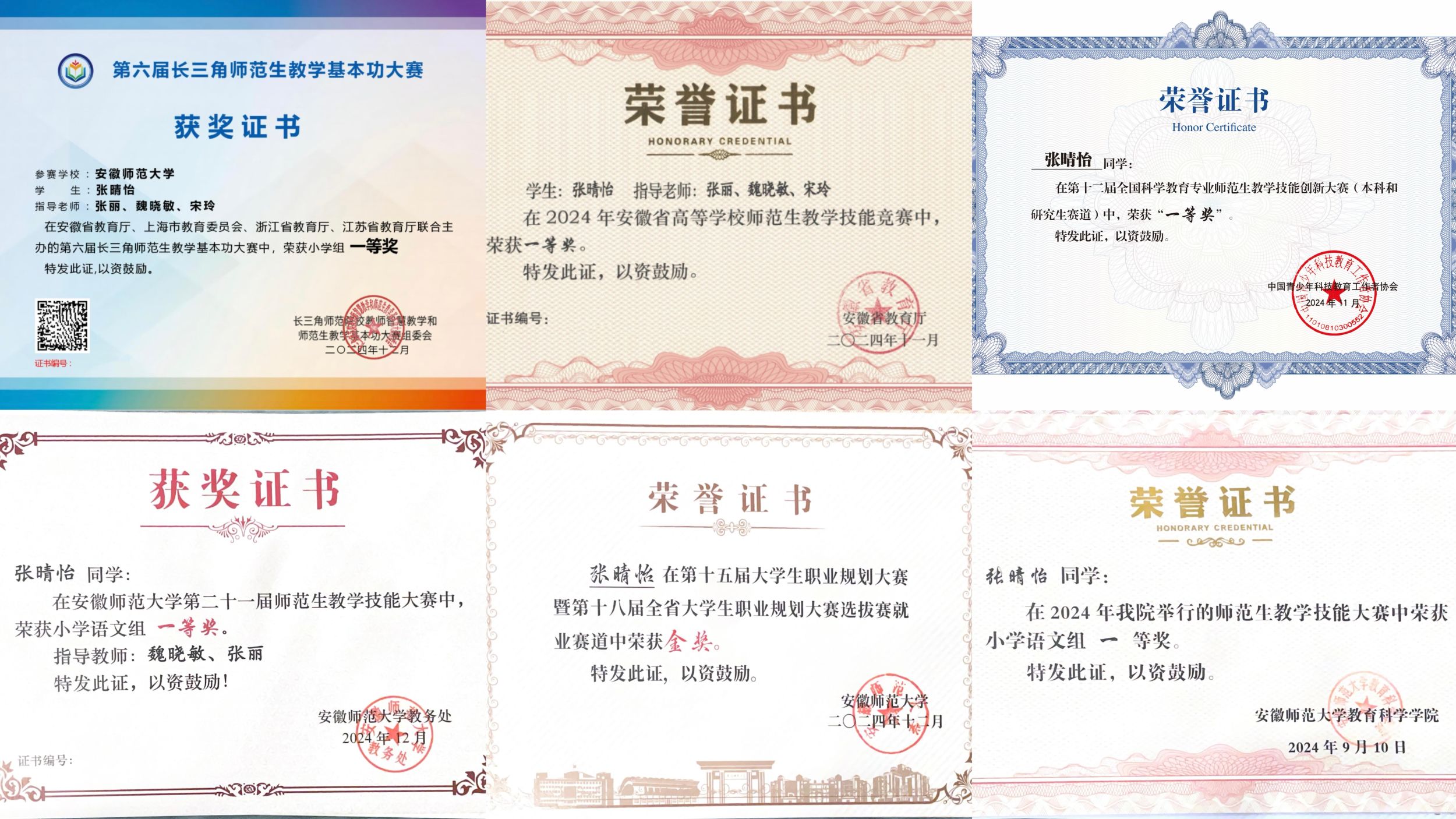 “千淘万漉虽辛苦,吹尽狂沙始到金”。张晴怡明白提升师范技能需要付出艰辛的努力和不懈的坚持。从入学起,她时常观看优秀教学案例视频,在一次次的模拟教学中,她不断总结经验教训,改进自己的教学方式,这些努力在各类比赛中得到了充分的体现。张晴怡在安徽师范大学第二十届师范生教学技能大赛小学语文组中荣获校级二等奖,在第二十一届师范生教学技能大赛小学语文组中,她成功斩获校级一等奖。同年10月,在2024年安徽省高等学校师范生教学技能大赛小学语文组中,她一路过关斩将,荣获省一等奖。2024年11月,她更是在第六届长三角师范生教学基本功大赛小学组以及第十二届全国科学教育专业师范生教学技能创新大赛中,凭借扎实的教学基本功和出色的现场发挥,均荣获一等奖,用实力证明了自己在师范技能方面的卓越水平。