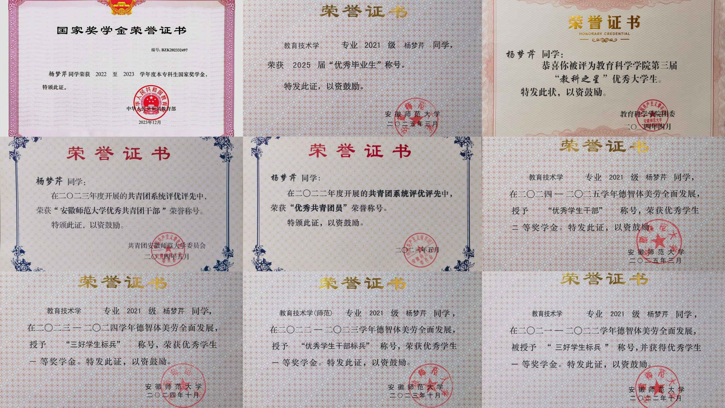 杨梦芹,女,中共党员,2021级教育技术学(师范)专业本科生,担任班级班长,安徽师范大学2025届优秀毕业生,曾获2023-2024学年“国家奖学金”,现推免至华中师范大学攻读硕士学位。