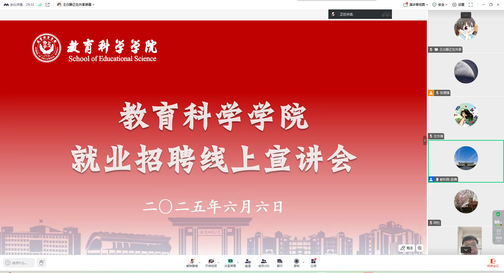 为进一步促进毕业生高质量充分就业,深化校企合作,2025年6月6日下午,365英国上市官网召开就业招聘线上宣讲会。学院党委书记许国飞、学院党委副书记杜凤,2025届毕业班辅导员赵茜、张理强,10余家用人单位,以及2025届未就业学生代表、2026届学生代表参与此次会议。会议由赵茜主持。