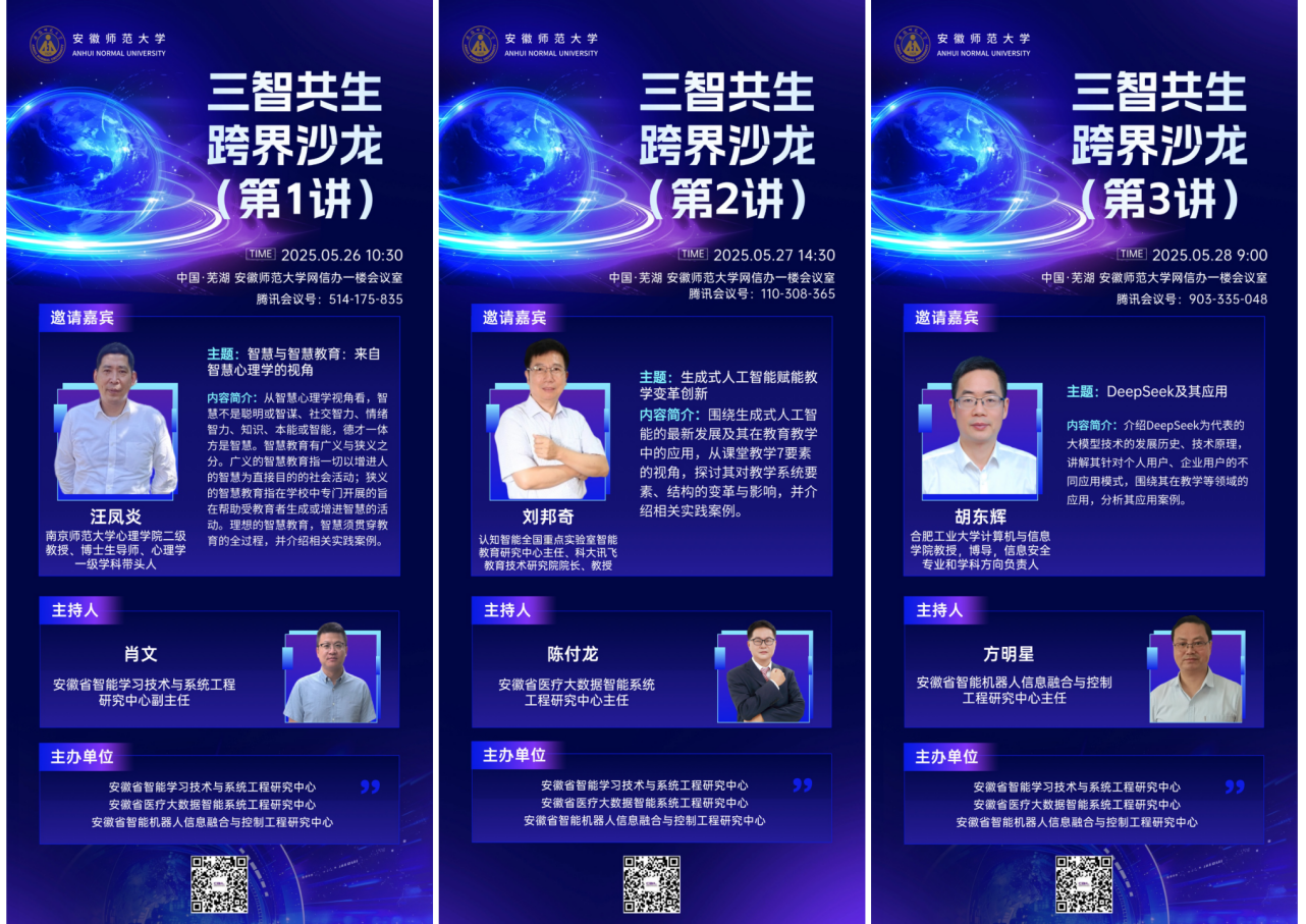 5月26日至28日,由我校安徽省智能学习技术与系统工程研究中心、安徽省医疗大数据智能系统工程研究中心、安徽省智能机器人信息融合与控制工程研究中心三家省级工程研究中心联合主办的“三智共生跨界沙龙”(以下简称“沙龙”)成功举行。沙龙采取线上线下相融合模式,以三场主题讲座为核心,构建起心理学、人工智能与计算机科学的跨学科对话桥梁。来自教育学、人工智能、心理学等领域的专家学者、学校相关管理部门领导老师以及老师同学300余人共同参加。