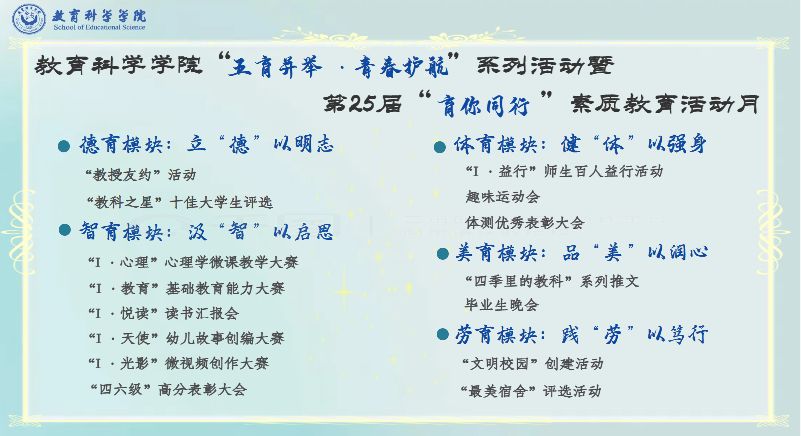 365英国上市官网第25届“育你同行”素质教育活动月全面落实素质教育理念,充分发挥学院特色,以丰富多元的形式和充实深刻的内容,为同学们搭建了一个展示自我、提升能力、交流学习的广阔平台,提升了教科学子综合素养。