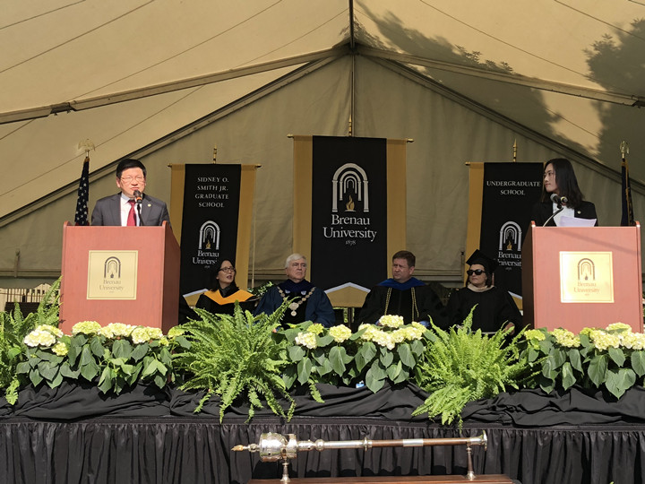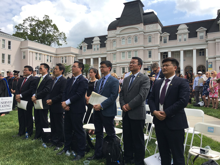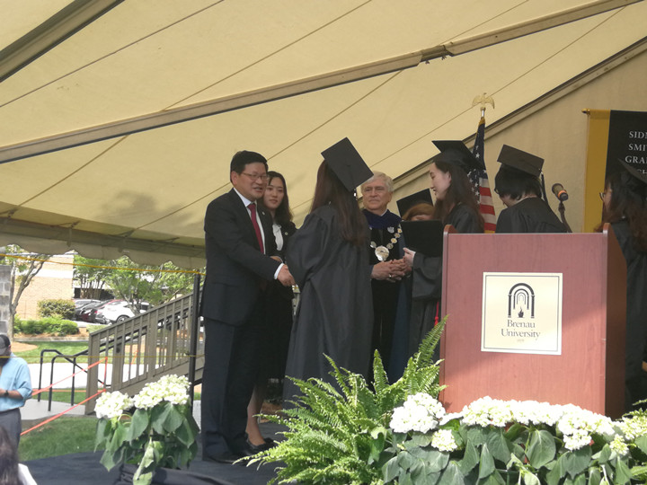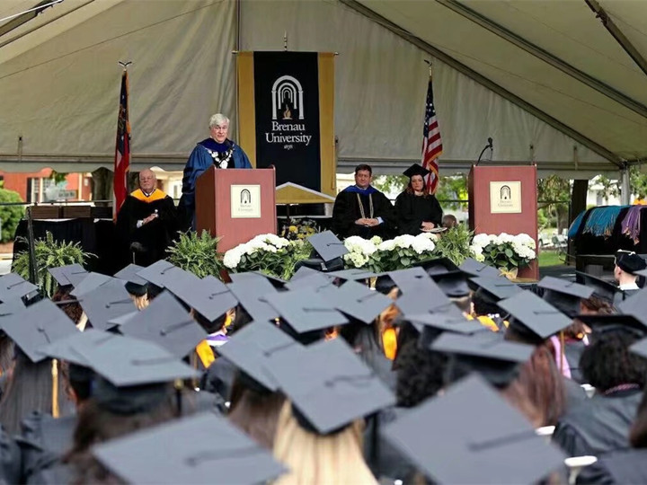 本网讯(教科院 管璇 潘晨)美国东部时间2019年5月4日上午9点半,美国布莱诺大学春季毕业典礼于校园户外的草坪上隆重举行。教科院2015级学前教育(中美合作)全体同学参加了毕业典礼。同学们顺利完成了在美国布莱诺大学后两年的学业,为大学四年的学习画上了完美的句号。从大一时的青涩懵懂到毕业时的踌躇满志,从初踏异国他乡的焦虑不安到如今毕业典礼的从容不迫,大学四年,同学们刻苦学习,砥砺前行。2015级8名同学中的6名同学考入了伦敦大学学院、宾西法利亚大学、匹兹堡大学、格拉斯哥大学、爱丁堡大学、伯明翰大学等世界名校继续读研深造。校党委书记顾家山、国际交流合作处处长黄圣炯、365英国上市官网副院长张更立专程前往美国参加了同学们的毕业典礼。