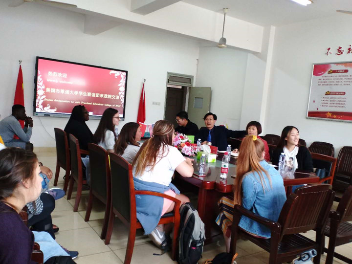 本网讯(教科院 王芬莲)5月8日下午,我院三楼会议室济济一堂,一片欢声笑语。学院2017、2018级学前教育中美班学生、部分16级中美班返校学生在此欢聚,热烈欢迎美国布莱诺大学Jordan Marie和Jessica Ann带领的学生联谊团来访。院长桑青松、副书记张如华、学前中美专业负责人赵学菊及学前教育专业教师朱立新、王芬莲等参加了会见活动。