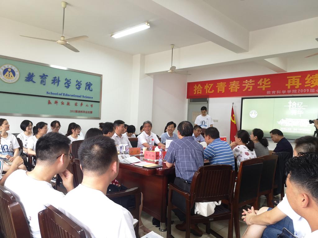 在返校院友座谈会上,师生执手言欢,畅叙当年情谊,交流岁月点点滴滴。副校长朱家存,时任领导、教师、辅导员以及现任教科院领导班子出席座谈会。大家共同观看毕业纪念宣传片,朱家存向校友毕业返校表示热烈欢迎和美好祝愿,希望他们在未来的人生路上勇于拼搏,敢于开拓,用师大精神砥砺奋进,为国家建设贡献力量,为母校发展贡献才智;院长桑青松简要回顾了近年来学院发展现状、专业建设、博(硕)士授予点、师资队伍、科研平台、人才培养的基本情况,张如华、何海燕、辛治洋对校友们多年来对学院的关心和支持表示衷心感谢,并希望大家多回母校看看,多为学院发展提出宝贵意见。学院党委书记方泓勉励校友们要担当时代重任,继续进取创造,将个人的前途与国家命运紧密联系在一起,将人生价值与实现民族伟大复兴有机结合起来,在各自的工作岗位上呈现最美的自己,用实际行动和良好表现为母校母院争光添彩。