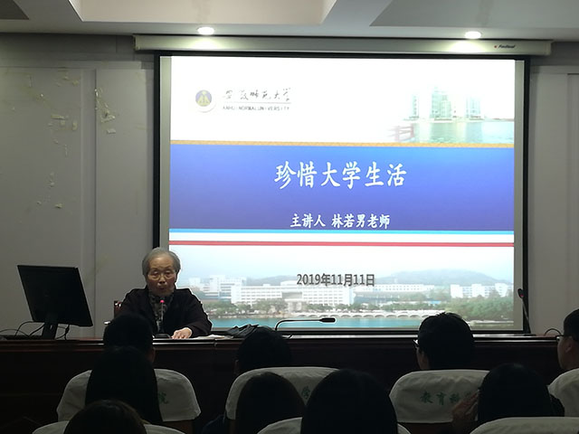 满头银丝精神矍铄的林老师刚步入报告厅就赢得同学们热烈的掌声。林老师从自己的求学生涯说起,瞬间拉近了与学生们的距离。88岁高龄的林老师出生于北京,早年就读于华东师范大学,毕业后服从国家分配来到安徽师范大学任教。