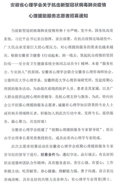 目前,安徽省心理学会联合我院心理学系发起了抗击新型肺炎疫情心理援助服务志愿者招募通知,大家踊跃报名中,短短一天就有近100人的全省大中小学、心理学专业机构人员报名参加。据悉下一步,将根据志愿者专业特点者分成督导培训组、咨询服务组、科普宣传组和综合协调组等四个工作小组。积极开展远程心理咨询和治疗服务,通过电话、QQ等媒介为求助的医护人员、患者及其家属以及社会公众提供心理咨询和危机干预。整理与编写抗击疫情心理科普材料,积极传播心理援助服务相关信息,为公众提供心理健康宣传教育。