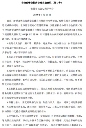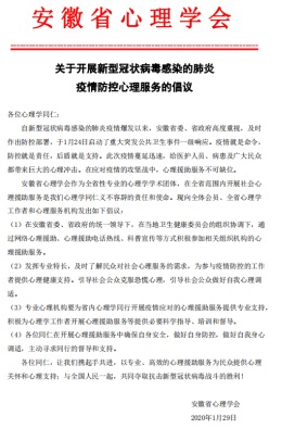 2020年1月29日,安徽省心理学会理事长、博士生导师、葛明贵教授组织动员全省心理学工作者,以安徽省心理学会名义发布了《关于开展新型冠状病毒感染的肺炎疫情防控心理服务的倡议》。同时,安徽省心理危机干预学会副会长、心理学副教授何元庆和安徽省社会心理学会副会长、心理学副教授王道阳也组织相关人员分别以各自学会名义发布了《心理免疫,从我做起》的倡议书和《公众疫情防控的心理自助建议》的心理援助建议。