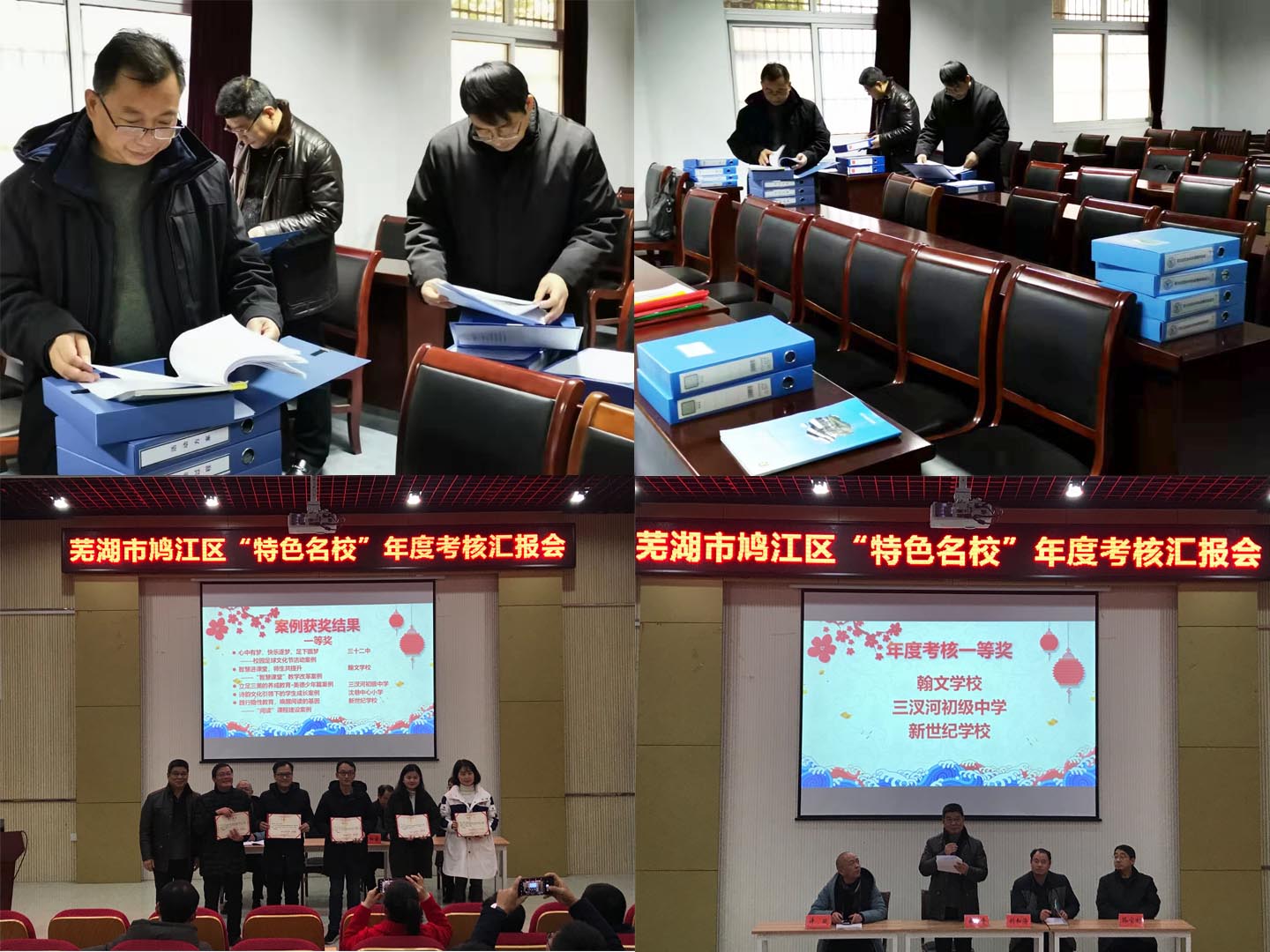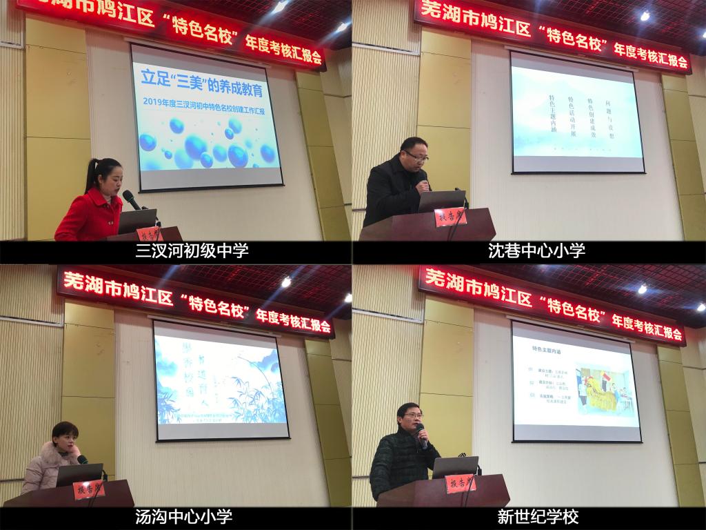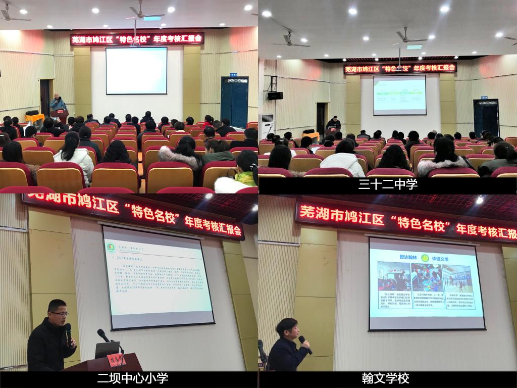 本网讯(教科院 姜惠玲/刘和海)依据芜湖市鸠江区政府正式出台的《鸠江区教育系统“三名工程”实施意见》,本着“以评促建”的宗旨,2020年1月16日,我院与鸠江区教育局联合举办了“特色名校”2019年度考核汇报会。汇报会于芜湖市第三十二中学报告厅召开,由鸠江区教育局许斌科长主持,鸠江区教育局朱红星处长、许斌科长、我院葛明贵教授、路宝利教授、刘和海教授共同组成考核组,担任本次会议评委,各创建学校出席了会议。
