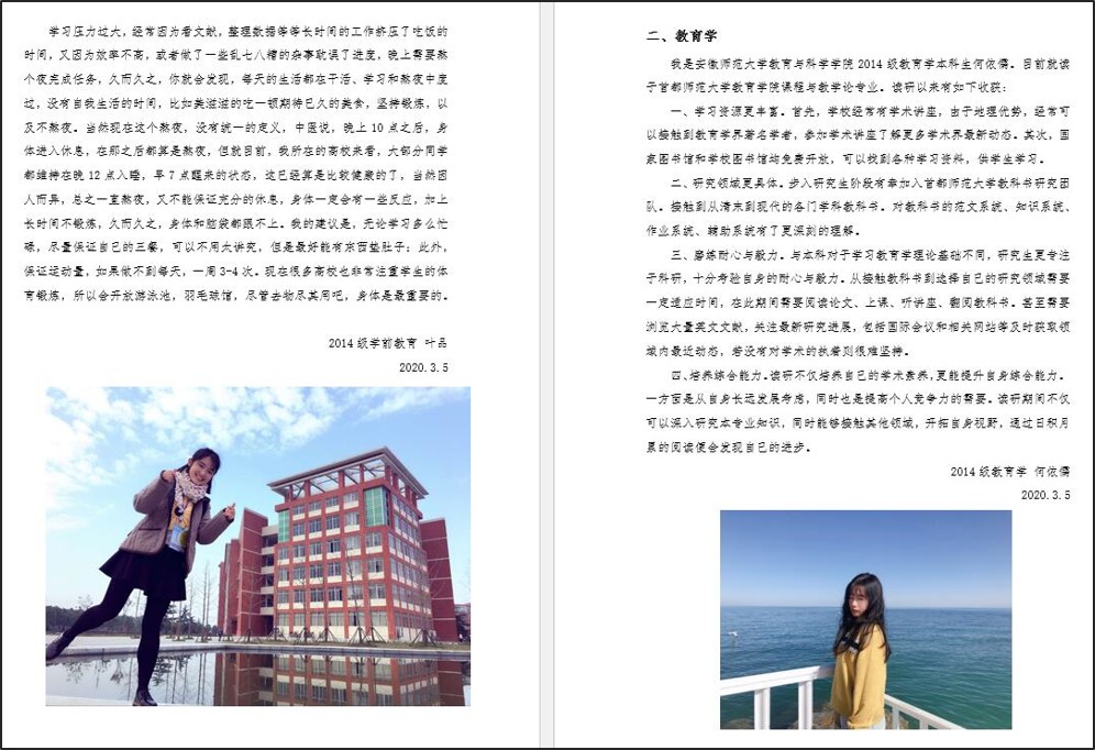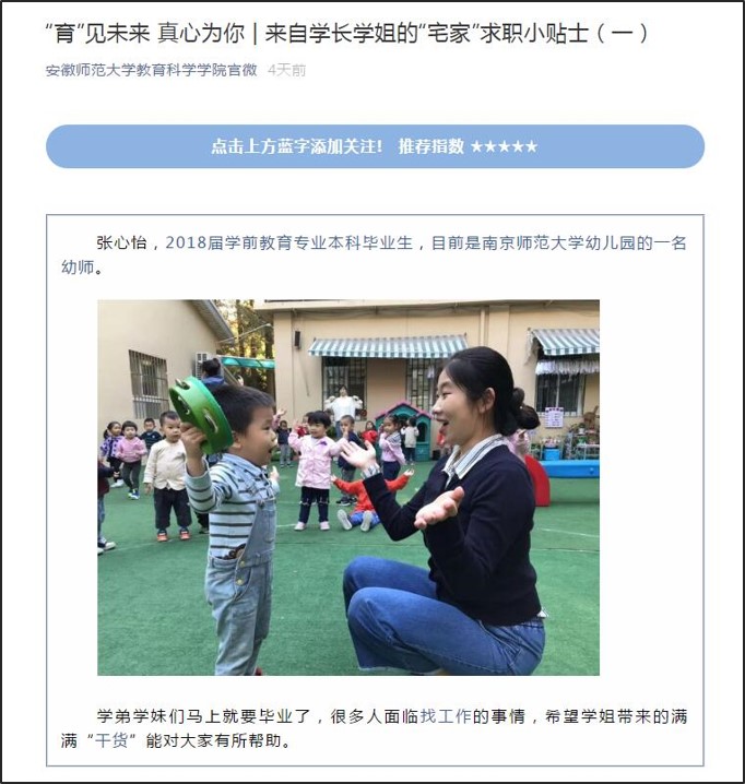 此次疫情爆发期间,已毕业的历届教科学子成为最宝贵的服务资源。学院专门组织优秀校友开展就业帮扶活动,通过视频讲技巧、微信谈经验,书信说方法,帮助各专业毕业生增强就业技能。优秀校友结合亲身经历线上说法,给大学生进行职业生涯规划教育和就业指导,为毕业生求职“指点迷津”,受到普遍好评。毕业生们纷纷表示“在这样一个特殊时期能够得到学长学姐的帮助非常开心,定将脚踏实地,把握机遇,顺利就业,今后感恩母校、回馈社会。”截至目前,共有来自各专业的21名优秀毕业生提供就业帮扶类文章24篇,学院也将通过微信公众号和就业帮扶QQ群陆续推送。