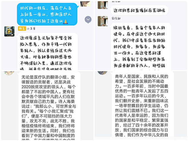 为号召学生“不忘初心,牢记使命”,我院积极响应校团委号召,组织广大团学青年学习《习近平总书记关于新型肺炎疫情防控的系列重要讲话精神》、收看近期中央广播电视总台《新闻联播》节目,学习近期《人民日报》有关社论精神,在线收看东方卫视在线节目《这就是中国》第53期《百年未有之大变局(上)》。线下自学后,同学们在线上进行交流,发表各自的心得体会。19级学前教育金茹芳同学对比了国内和国外疫情防控后,对“中国是有强烈责任感的文明型大国”表示赞同,在疫情这场大考中,中国的表现值得全球学习。17级教育学孙文霞表示:“我们正面临百年未有之大变局,也是百年未有之大机遇。我们要抓住机遇,奋发有为,直至完全的胜利。”作为新时代的青年教科人是祖国未来的希望,更应该积极向上,弘扬社会正能量,积极关注世界格局与中国的发展,为实现中国梦贡献自己的力量。