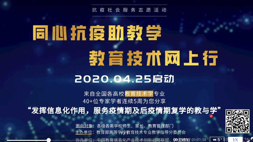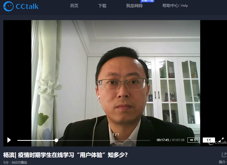 本网讯(教科院 吴钦金 鲍昔凤 朱正涛)2020年5月10日15:00点,我院教育技术学专业负责人杨滨副教授,响应教育部高等学校教育技术专业教学指导分委员会“同心抗疫助教学,教育技术网上行”的社会服务志愿活动,面向全国开展了题为“疫情期间学生在线学习‘用户体验’知多少?”的公益讲座。