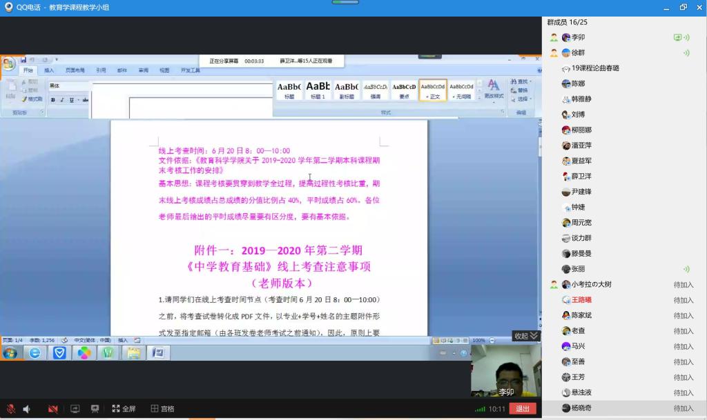 本网讯(教科院文)为贯彻落实《关于做好2019-2020学年第二学期本科课程期末考核工作的通知》(教务处〔2020〕22号)《365英国上市官网关于2019-2020学年第二学期本科课程期末考核工作的安排》的文件精神,确保我校教师教育类核心课程—《中学教育基础》(校级课程思政示范项目、校级“一流本科课程”孵化建设项目)期末考核顺利进行, 6月19日晚19点《中学教育基础》课程团队依托QQ群平台,召开了期末考核线上布置会议,围绕期末考核的相关事宜展开了充分的沟通和交流。本次会议由《中学教育基础》课程负责人李卯老师主持,参加人员有周元宽、谈力群、柳丽娜、尹建锋、徐群、张丽、夏益军、滕曼曼、薛卫洋、陈娜等本学期任课老师以及五位研究生助教。