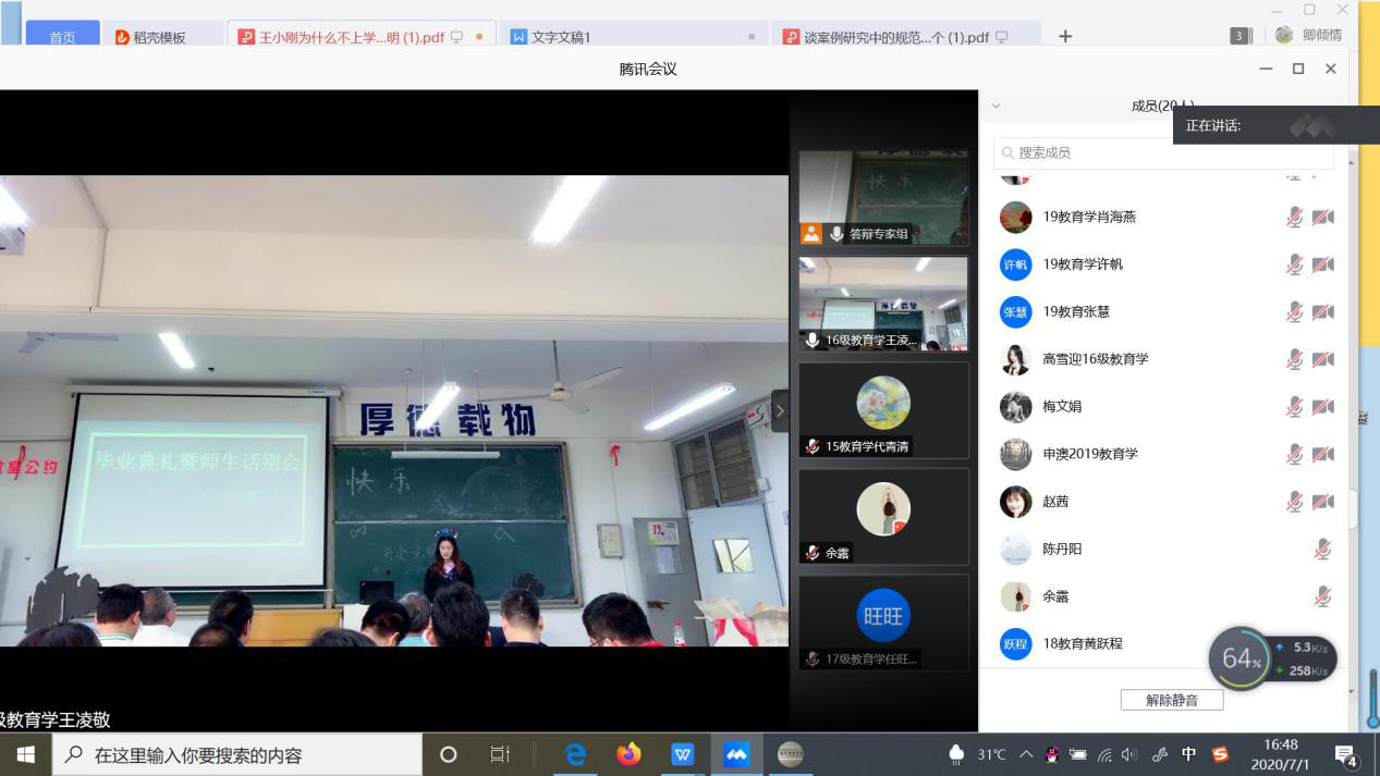 由于疫情原因,部分同学无法返校参与此次的活动,为了保证每一位学生不留遗憾,专业负责人徐赟老师创新了此次毕业典礼暨师生话别会的形式,采取线上与线下相结合,活动全程采用腾讯会议面向全体教育学专业同学、往届校友及毕业班家长直播。新的形式既为了由于疫情和工作原因无法现场参加的高雪迎、宋丹丹、沈须晴三位同学通过直播圆一次毕业典礼梦,也让家长和校友见证又一届“后浪”从教育学专业学成出发,亦通过活动让低年级的学弟学妹们更加珍惜在校学习的时光。