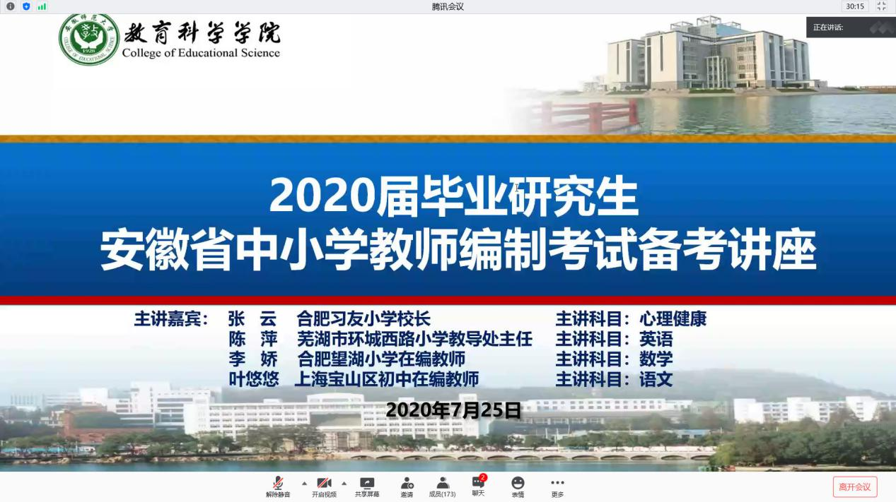 7月25日下午14:00,学院通过腾讯会议开展2020届毕业研究生中小学教师编制考试备考经验分享会。本次活动特邀四位优秀院友:17级非全心理健康专业研究生张云,17级非全小学教育专业研究生陈萍,17级非全教育管理专业研究生李娇,18级小学教育专业研究生叶悠悠。我院副院长聂竹明、研究生管理办公室叶方舟及170余名硕士研究生在线参与,活动由19级教育技术学专业研究生姜惠玲主持。聂院长强调要学习贯彻习近平总书记的回信精神,把落实回信精神同做好毕业生就业“百日冲刺”行动结合起来,确保我院毕业生就业局势总体稳定。强调今年要积极响应国家重大战略,持续拓展多种就业渠道,整合学生就业资源,搭建就业平台;要有针对性地加强毕业生就业帮扶,充分利用校友资源,强化朋辈帮扶,提高毕业生求职能力。